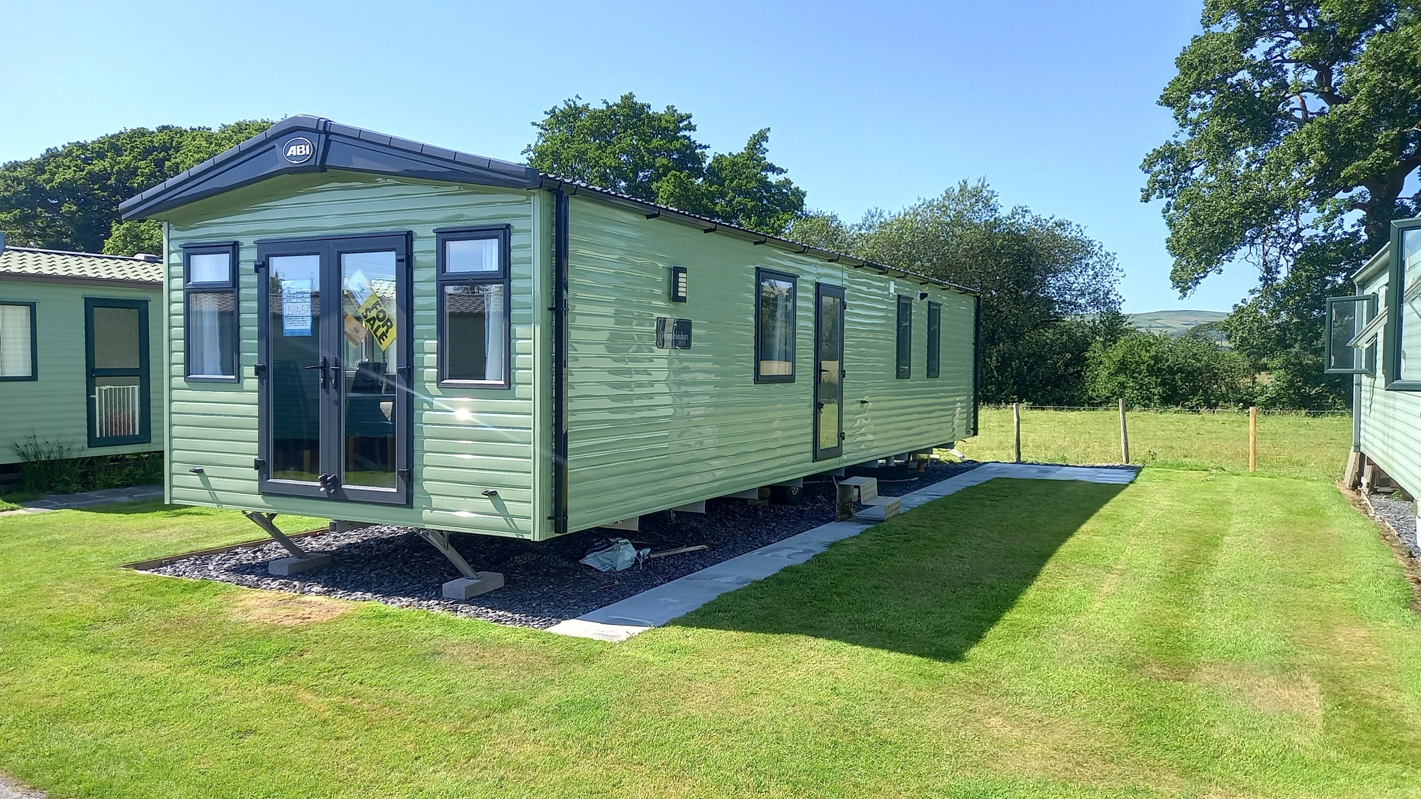 A modern, spacious caravan located on a spacious outer plot with views of open countryside.